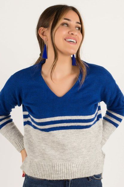 Kadın Gri-Saks V Yaka Çizgili Kazak KZK1121 ürününü indirimli fiyatıyla trendyol.com sitesinden satın alabilirsiniz.