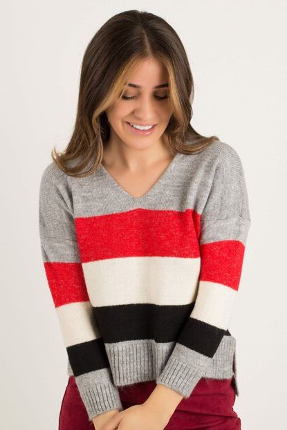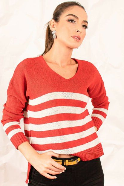 Kadın Kırmızı V Yaka Çizgili Kazak KZK100-K Morpile | Trendyol ürününü indirimli fiyatıyla trendyol.com sitesinden satın alabilirsiniz.