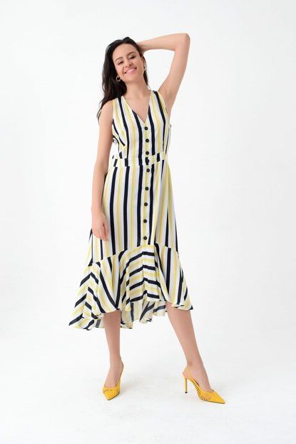 Hanna\u0027s Kadın Dikey Çizgili Kolsuz Eteği Volanlı Düğmeli ... ürününü indirimli fiyatıyla trendyol.com sitesinden satın alabilirsiniz.